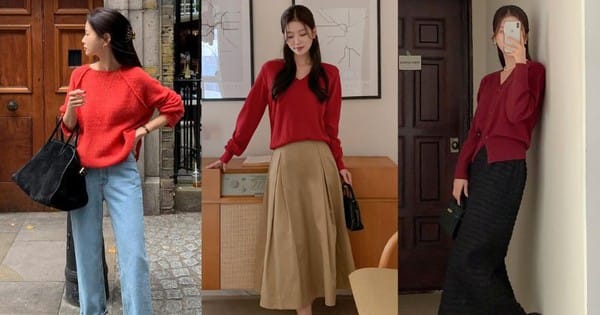 Áo len màu đỏ kết hợp ăn ý với chân váy chữ A màu xám, từ đó tạo nên tổng thể trang phục nữ tính, dịu dàng. Bộ đồ trên còn “hack” tuổi hiệu quả, quý cô 30+ rất nên tham khảo để style mùa lễ hội thêm trẻ xinh, ngọt ngào.