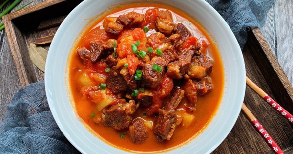 Nguyên liệu: 500g thịt ức bò; 3-4 quả cà chua cỡ vừa; 1 gốc hành baro xắt khúc ngắn; 3 lát gừng; 3 tép tỏi; 1 củ cà rốt; 2 củ khoai tây; một ít nước tương đen; một ít nước tương; một ít rượu nấu ăn; một ít đường; một ít muối; một ít hạt tiêu đen; 2 lá nguyệt quế; 1 cái hoa hồi; 1/2 quả ớt chuông đỏ (tùy chọn, để tăng hương thơm).