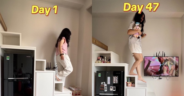 Không gian sống của Hà Thu gây chú ý vì nhỏ xinh, gọn gàng và rất đẹp mắt. Có thể thấy cô nàng đã tận dụng triệt để mọi không gian để giúp căn nhà trông sinh động và tăng khả năng lưu trữ hơn. Dưới những bậc cầu thang là nơi mà Hà Thu tận dụng để chứa đồ. So với ngày đầu tiên, ở ngày thứ 47, cô nàng đã lắp thêm chiếc TV nhỏ ở ngay lối lên cầu thang, vừa tiện cho nhu cầu sinh hoạt vừa không gian thêm phần sinh động