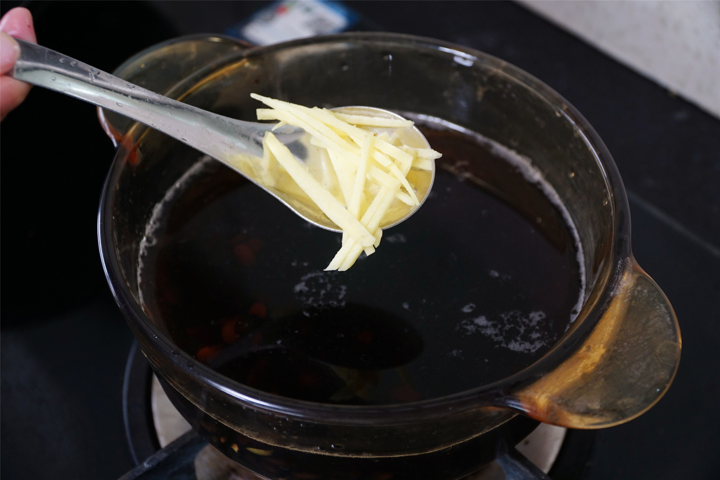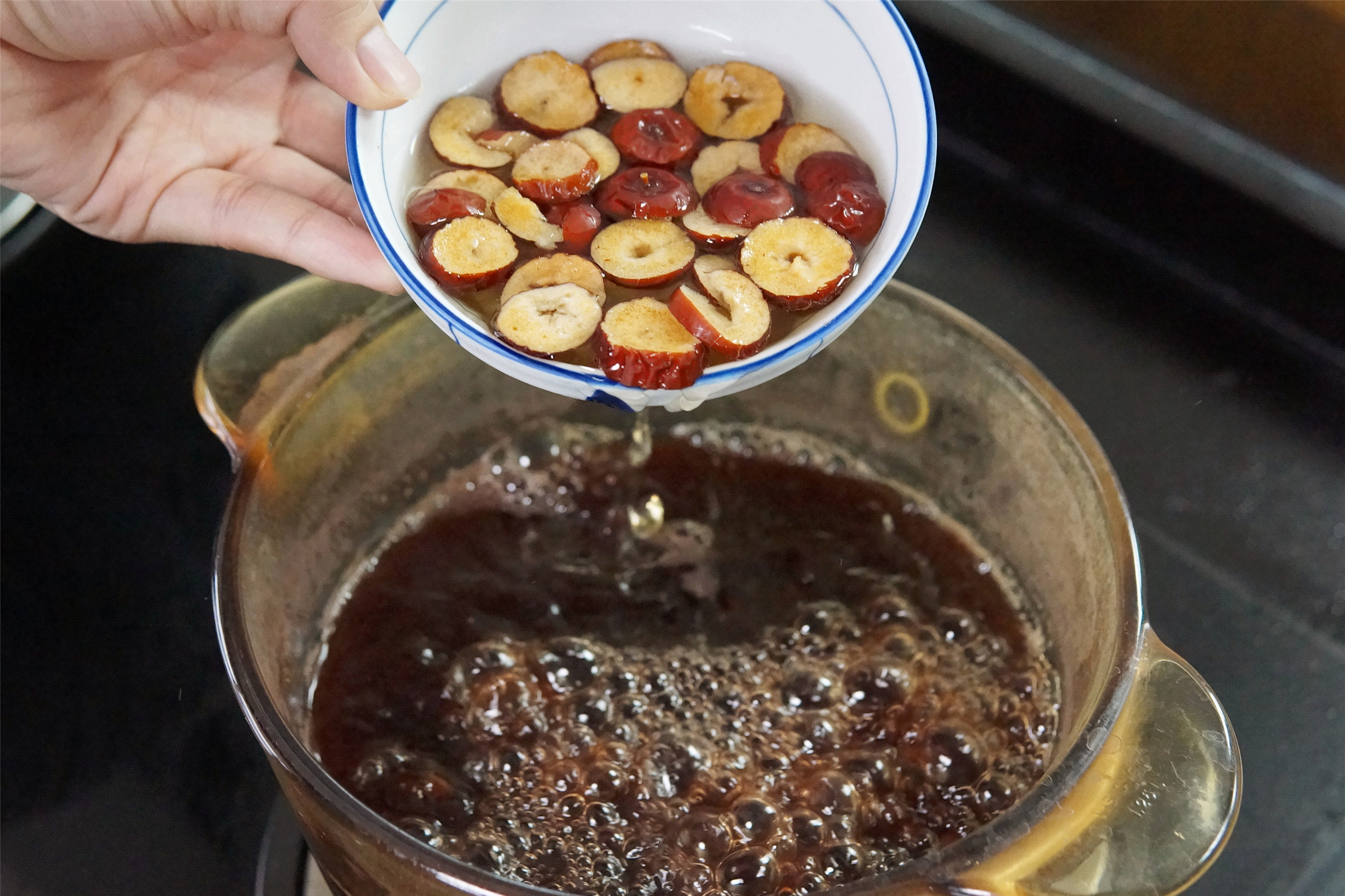 Bước 2: Tiếp đó bạn thêm gừng thái sợi và táo tàu thái lát vào, tiếp tục nấu trong 5 phút để hương thơm của gừng và vị ngọt của táo tàu tỏa ra hoàn toàn. Cuối cùng, cho đường nâu vào khuấy đều đến khi tan hết. Đun thêm một phút nữa rồi tắt bếp, lấy ra bát và thưởng thức khi còn nóng.