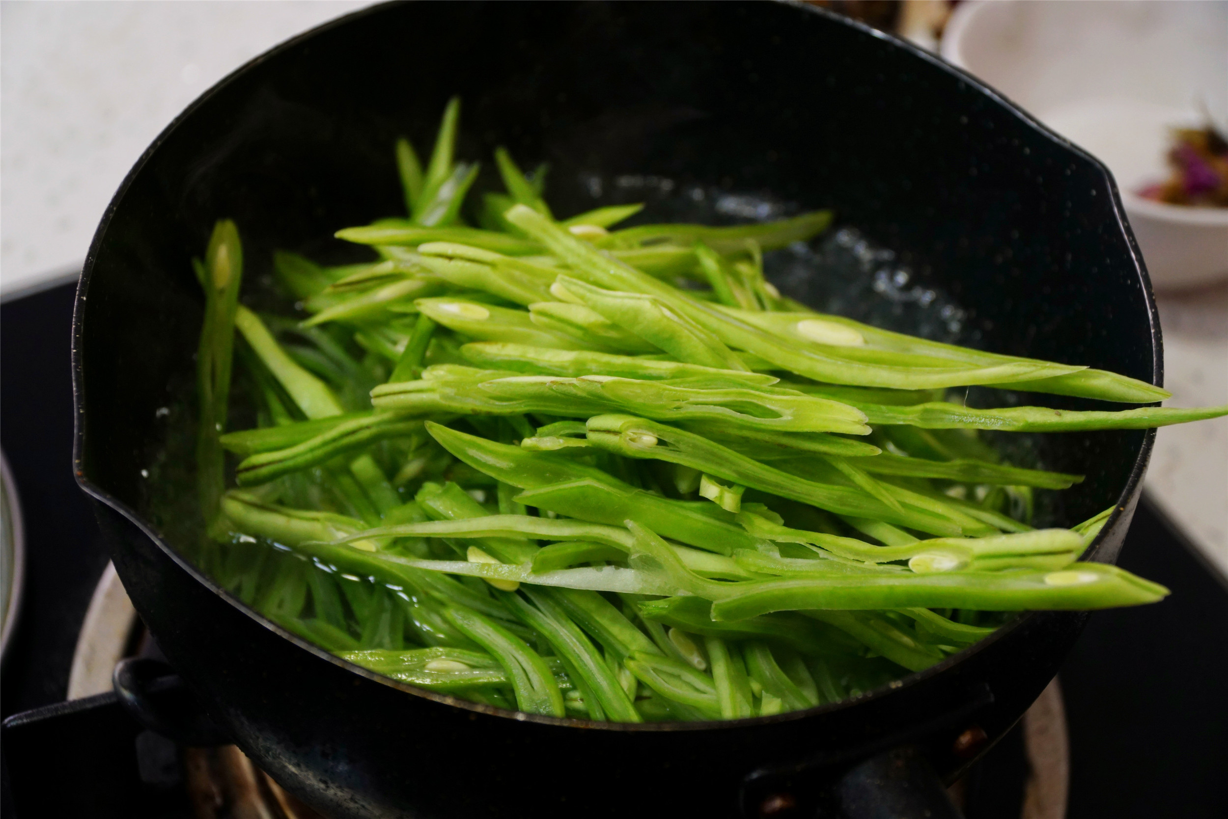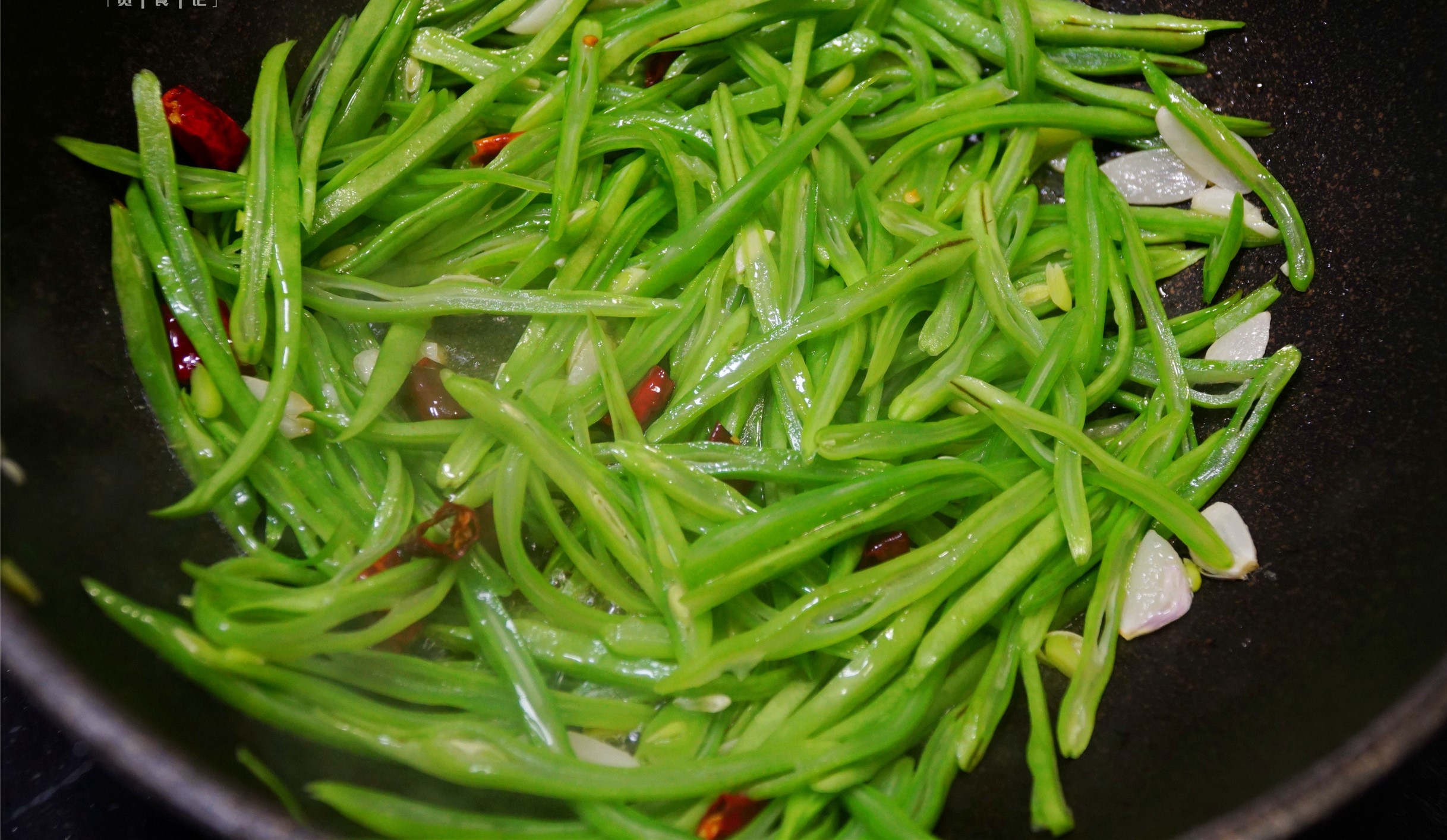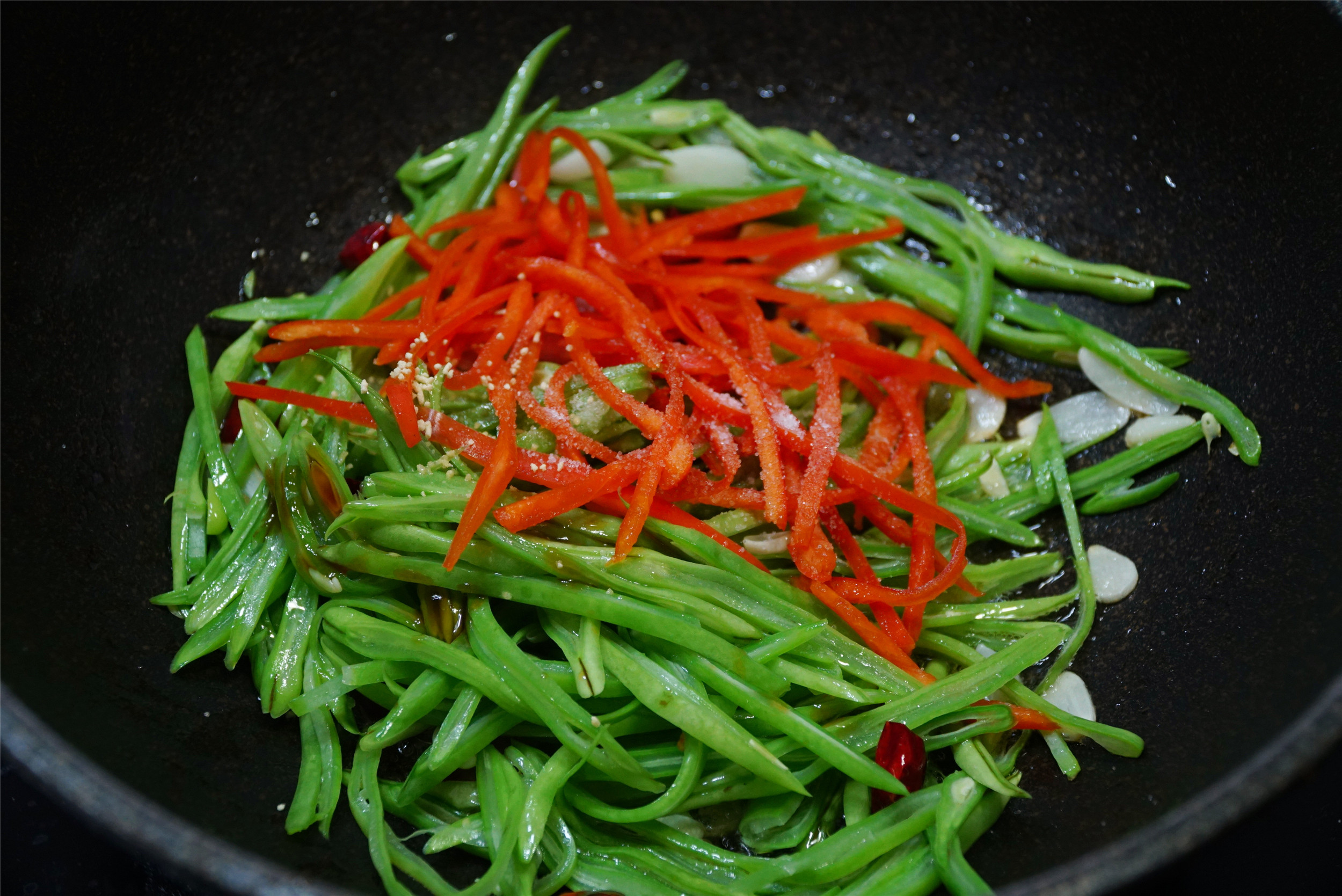 Bước 2: Cho một mỡ heo vào chảo. Khi mỡ nóng, cho tỏi băm vào phi thơm. Đổ đậu cô ve đã chần vào, đảo nhanh trong 2 phút. Sau khi đậu chín sơ, thêm dầu hào và nước tương vào. Xào đều trên lửa lớn để gia vị thấm đều vào đậu cô ve. Cuối cùng thêm ớt chuông đỏ thái sợi, nêm thêm chút muối và tinh chất cốt gà vừa đủ, xào trong 30 giây và lấy ra đĩa.