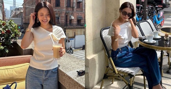 Áo cách điệu màu trắng và quần jeans xanh tạo nên bộ cánh nữ tính, thanh lịch mà vẫn thú vị. Đôi khuyên tai to bản, đồng hồ vàng đã tạo điểm nhấn vô cùng long lanh cho bộ đồ. Outfit này rất phù hợp với những buổi cà phê cuối tuần.