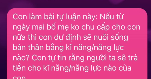 Thấy con trai đang học lớp 10 thời gian gần đây có phần chểnh mảng, mê game, một bà mẹ ở Hà Nội đã ra cho con một bài tập tự luận đặc biệt: “Nếu từ ngày mai bố mẹ không chu cấp cho con nữa thì con dự định sẽ nuôi sống bản thân bằng kỹ năng/năng lực nào? Con tự tin rằng người ta sẽ trả tiền cho kỹ năng/năng lực nào của con”.