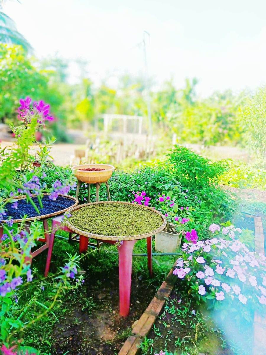 Mỗi sáng, chị dậy sớm để tưới rau, bắt sâu bằng tay. Buổi trưa chị tranh thủ làm việc nhà, chiều lại ra vườn nhổ cỏ, chăm rau, tưới nước ủ gừng ớt. Rau trong vườn thay đổi theo mùa: cải mèo, cải ngọt, cà rốt, rau muống, mồng tơi, rau lang, mướp… tất cả đều là giống thuần xưa – ít sâu bệnh, phù hợp với khí hậu nơi đây.