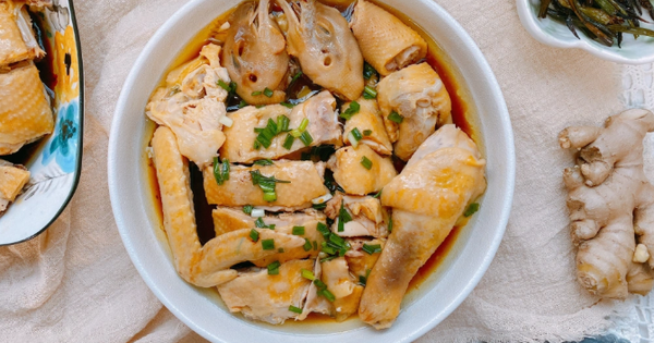 Bước 1: Sơ chế sạch gà sau đó xát muối và chút bột tiêu khắp trong và ngoài, ướp trong 20 phút. Rửa sạch rồi cắt hành lá thành từng khúc, giữ lại một ít để thái nhỏ. Cho nước vào nồi lớn, thêm gừng thái lát và rượu nấu ăn. Khi nước sôi, cho thịt gà vào, luộc ở lửa nhỏ trong 20 phút (cho đến khi dễ dàng dùng đũa xiên qua). Vớt thịt gà ra và để nguội.