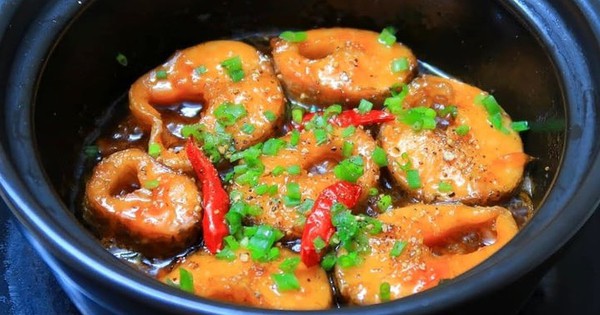 Khi cá săn lại, nước kho sệt và có màu đẹp, tắt bếp. Bạn rắc thêm chút tiêu xay và hành lá cắt nhỏ để tăng hương vị. Dùng cá kho nóng với cơm trắng và rau luộc rất ngon.