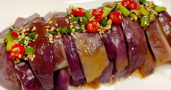 Chuẩn bị hỗn hợp tỏi băm, hành lá thái nhỏ, ớt, nước tương nhạt, đường và dầu mè vào bát và trộn đều. Để cà tím hấp nguội bớt, dùng đĩa ép xuống nhẹ nhàng để bớt nước thừa. Cho cà tím ra đĩa và rưới nước sốt lên. Rắc rau mùi và hạt vừng trắng lên trên rồi dùng ngay.