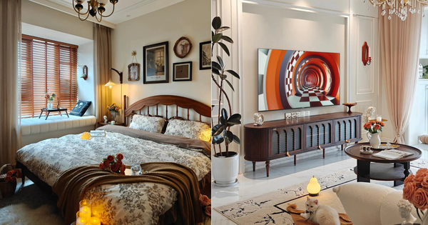 Dù chỉ vỏn vẹn 13m², phòng ngủ chính vẫn được chăm chút thành một góc nhỏ phục cổ đầy cảm xúc. Không gian đơn giản, sạch sẽ, thoải mái, nhưng vẫn toát lên nét lãng mạn khó cưỡng. Phần cứng tối giản: không trần thạch cao cầu kỳ, chỉ viền đá thạch cao nhẹ nhàng, kết hợp sơn latex ấm áp. Toàn bộ không khí phục cổ được tạo nên nhờ nội thất mềm: giường gỗ óc chó nguyên khối, tủ đấu kết hợp bàn trang điểm cùng tông, bức tranh tường cổ điển và đèn tường tinh xảo. Mọi góc nhỏ đều là hiện thân của sự yêu thích, làm trọn vẹn bầu không khí ấm cúng và thơ mộng.