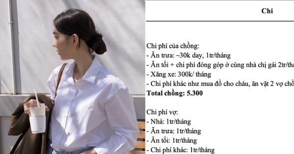 – Chi tiêu của vợ: 4 triệu. Bao gồm: Tiền nhà (1 triệu); Tiền ăn trưa (1 triệu); Tiền ăn tối (1 triệu); Chi phí khác (1 triệu).