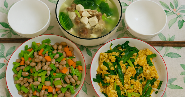 Chỉ cần 2 món 1 canh, bữa tối đã trọn vẹn cả hương vị sắc: Thanh mát của nộm cần tây lạc rang, đậm đà của trứng chiên hành sốt tương và ngọt lành của canh bò hầm cải xanh đậu phụ. Nguyên liệu rẻ, cách làm nhanh, nhưng giá trị lại gấp trăm lần khi cả hai cùng ngồi quây quần bên mâm cơm.