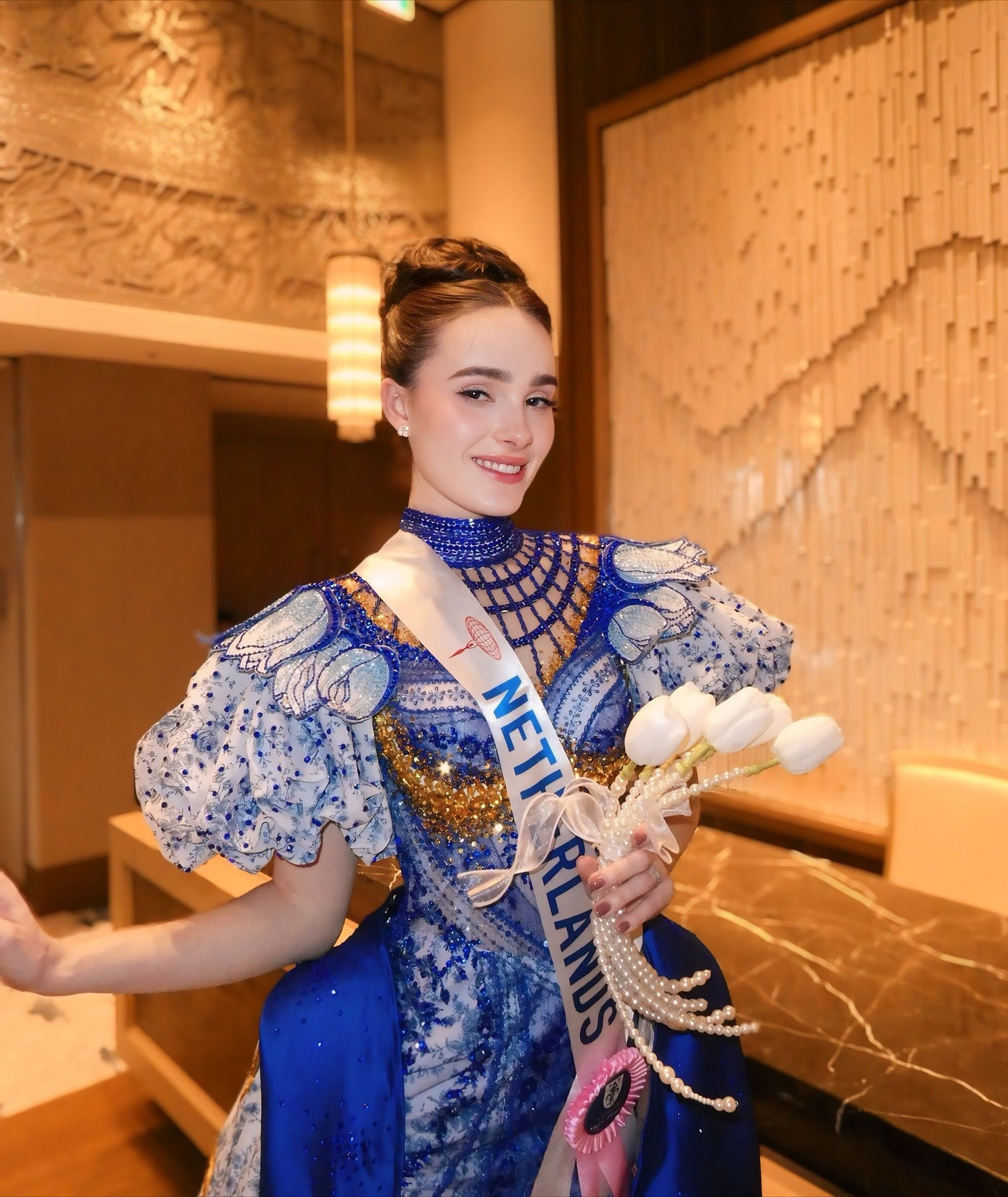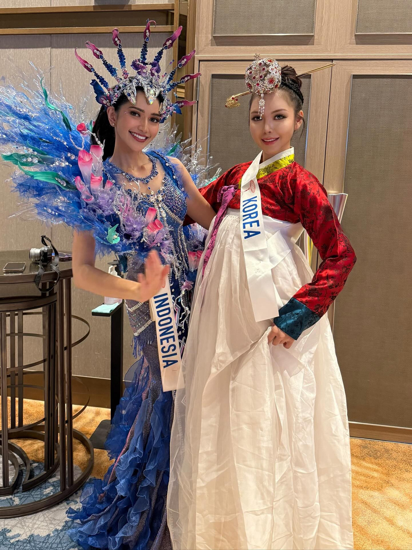 Ngày 16/11, các thí sinh của cuộc thi Hoa hậu Quốc tế tham gia trình diễn trong phần thi trang phục dân tộc. Trong hậu trường, đương kim Hoa hậu Huỳnh Thị Thanh Thủy đã có mặt để cổ vũ tinh thần thí sinh.