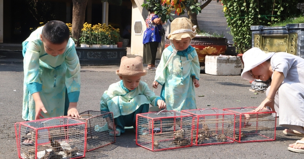 Trẻ được mẹ đưa đi chùa và thả chim phóng sinh trong dịp đầu năm mới