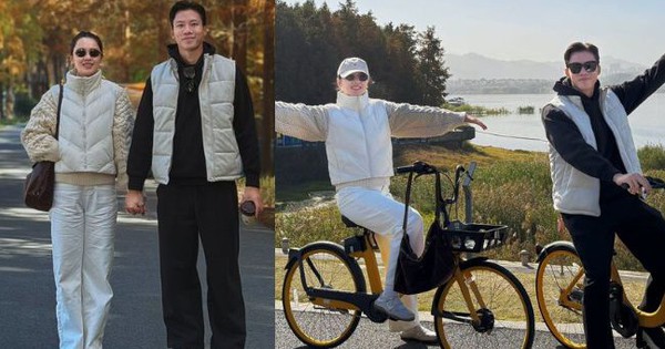 Cả hai xuất hiện trong nhiều khoảnh khắc cực cinematic. Lúc họ nắm tay nhau trên con đường rợp bóng cây, ánh nắng xuyên qua tán lá tạo cảm giác như một thước phim thanh xuân. Có khi lại ngồi cạnh nhau trên cầu gỗ, trò chuyện, cười nhẹ, nhìn nhau bằng ánh mắt đầy âu yếm. Đôi vợ chồng ngoài 30 cùng đạp xe bên hồ, dang tay tạo dáng cực “tự do – lãng mạn”, vibe như cảnh nam nữ chính đi hẹn hò trong phim. Họ cùng tung tăng giữa rừng cây đổi màu, khung cảnh đẹp như tranh, hai nhân vật chính tươi tắn, hồn nhiên như đôi bạn trẻ mới yêu….