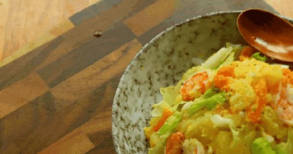 Bước 4: Cuối cùng, thêm một ít rau xà lách đã xé nhỏ và tôm, đây là nguồn protein và chất xơ cho bữa ăn. Sau đó bạn rắc thêm một chút muối tỏi mùi tây lên, trộn đều một lần nữa là có thể thưởng thức được rồi. Chắc chắn bạn sẽ không hối hận khi làm món ăn này vì nó thực sự rất ngon!