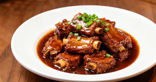 Bước 3: Tiếp đó đổ lượng nước sôi vừa đủ ngập sườn. Đun sôi trên lửa lớn, sau đó giảm lửa nhỏ và nấu trong 40 phút, giữ cho súp hơi sôi. Khi hết thời gian ninh sườn thì bạn chỉnh lửa lớn đến khi nước sốt sánh lại, rắc hành lá cắt nhỏ lên trên để trang trí và bày ra đĩa để hoàn thành món sườn kho mềm, có màu nâu đỏ tươi.