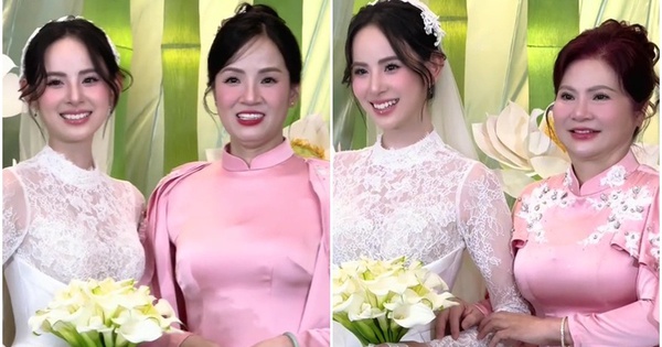 Trong ngày hạnh phúc của các con, 2 mẹ cùng mặc áo dài màu hồng giống hệt nhau, tươi cười rạng rỡ chụp ảnh. Đặc biệt, cả hai bà thông gia đều gây ấn tượng khi sở hữu nhan sắc xịn xò với nụ cười hiền hòa, ánh mắt dịu dàng.