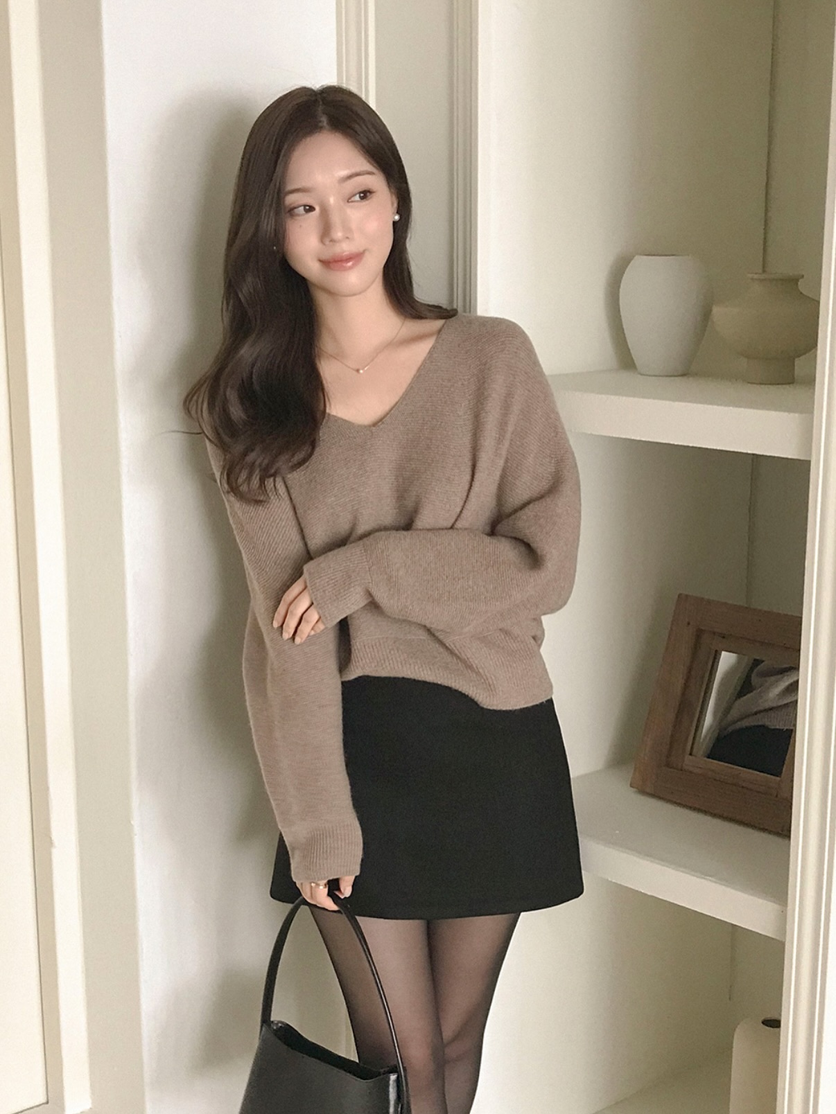 Áo len màu trung tính và chân váy ngắn