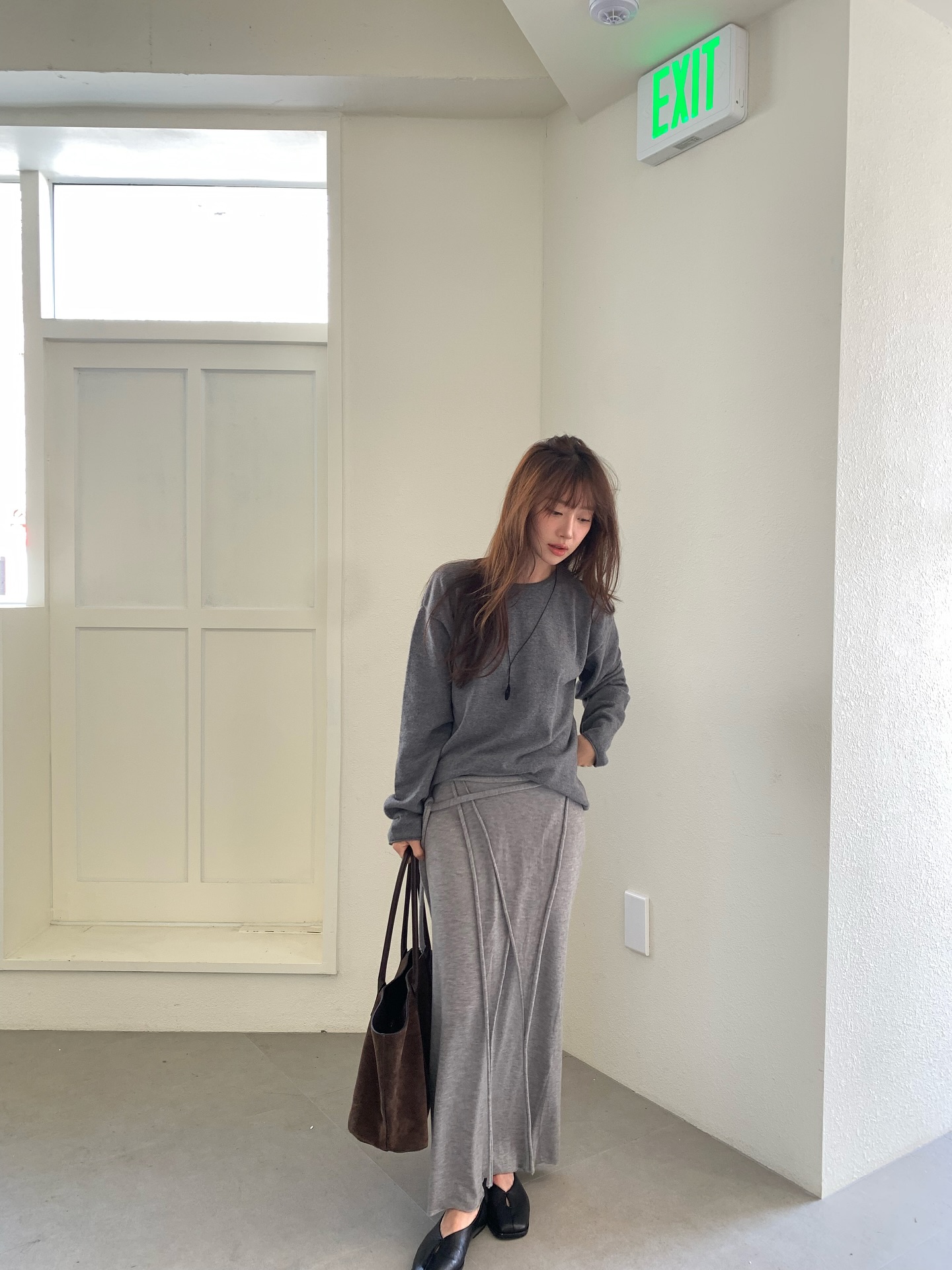 Áo len màu trung tính và chân váy dài