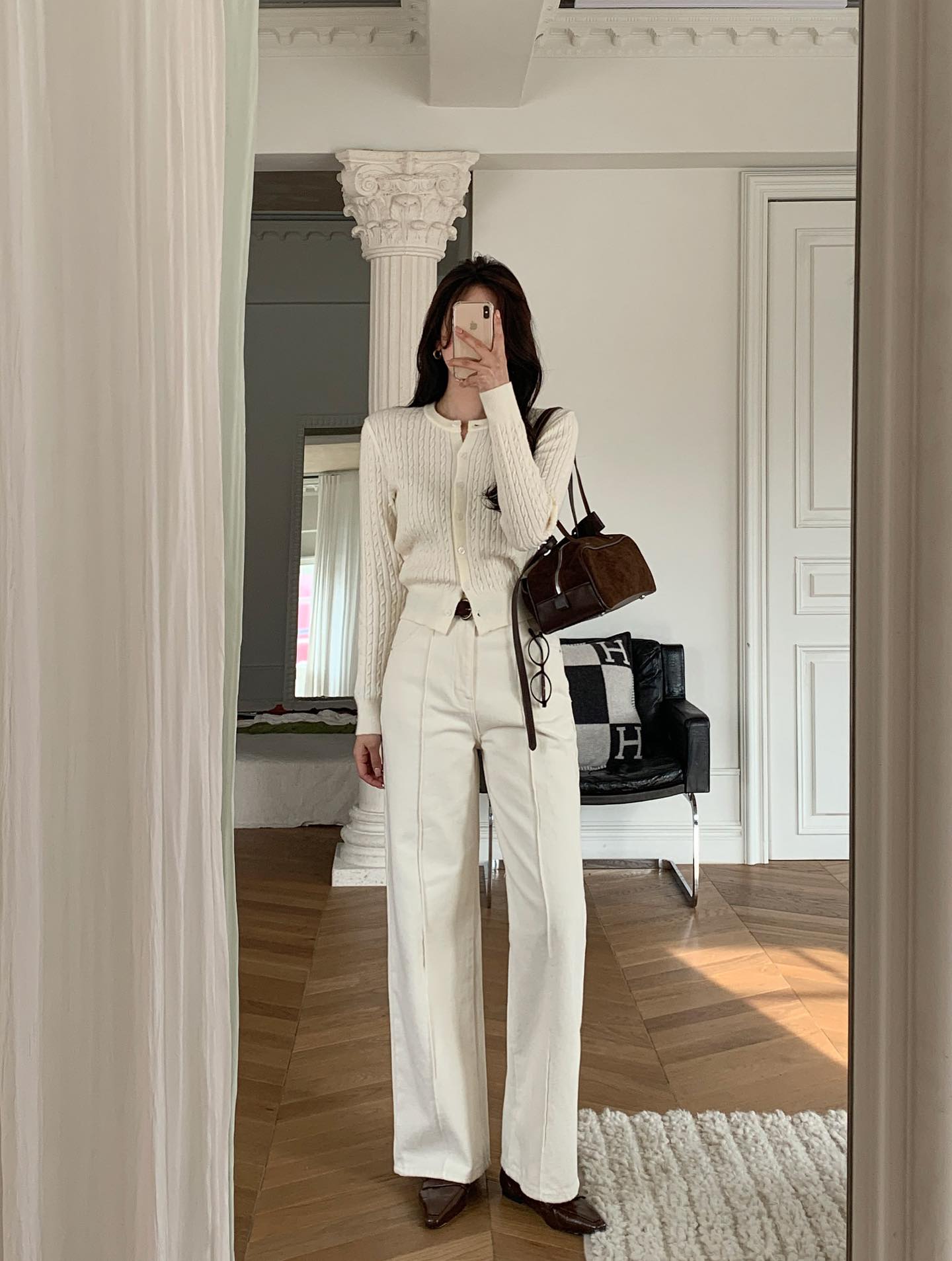 Hãy thử kết hợp áo len màu be nhạt hoặc xám tro với quần vải trắng ống rộng. Đôi giày mule, sandal hoặc sneaker trắng sẽ giúp tổng thể liền mạch và thanh thoát hơn. Nếu muốn tăng chút cá tính, bạn có thể khoác ngoài áo trench coat màu nâu nhạt hoặc mang túi xách màu đen để tạo điểm tương phản tinh tế.