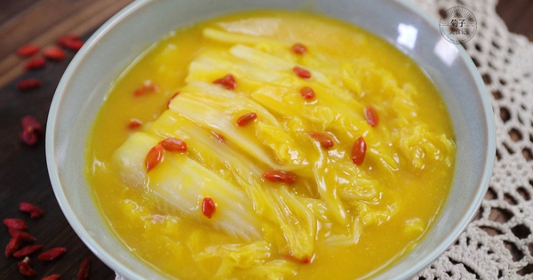 Đổ phần súp vàng óng (gọi là “kim thang”) lên đĩa cải thảo mini đã chuẩn bị, có thể thêm vài hạt kỷ tử cho đẹp mắt.
