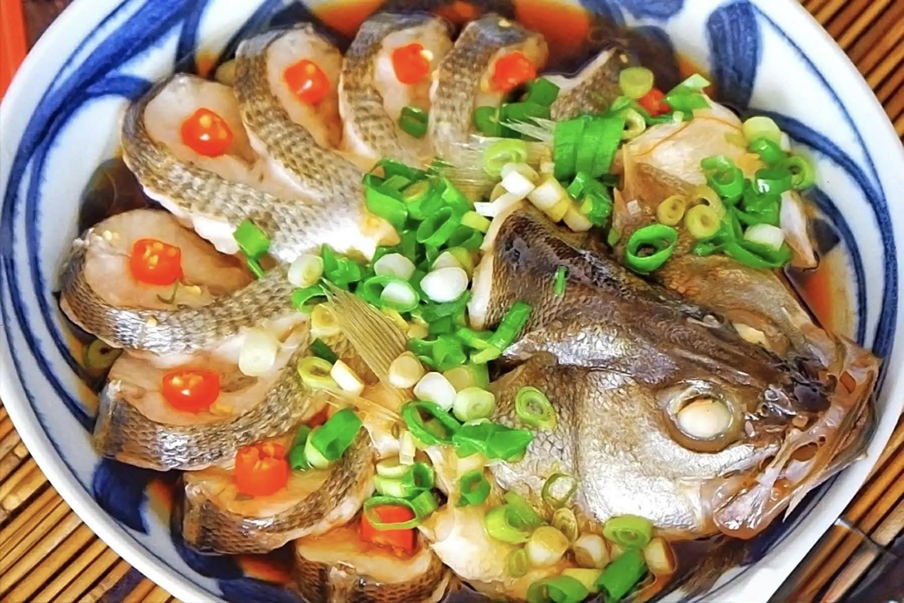 Nguyên liệu: 1 con cá vược, hành lá, gừng, tỏi, ớt khô, bột ớt, 1 cây tỏi lá, 1 thìa canh nước tương, lượng nước tương đen vừa phải, 1 thìa canh dầu hào, 1 thìa canh rượu gạo nếp, một chút muối, dầu ăn, 1 thìa canh tinh chất cốt gà.