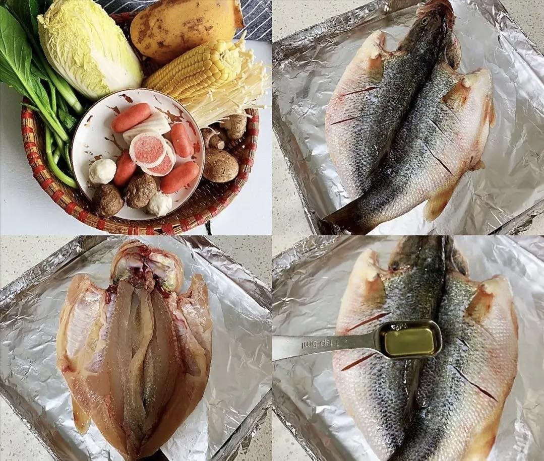 Bước 3: Đun nóng một chút dầu ăn trong nồi, phi thơm hành lá, gừng, tỏi và ớt. Sau đó cho 1 thìa canh nước tương đen và 1 thìa nước dùng lẩu vào, đảo đều cho đến khi dầu chuyển sang màu đỏ. Sau đó cho 1 thìa canh dầu hào và 1 thìa canh nước tương vào, đảo đều. Tiếp đó, cho 2 bát nước vào nồi, đun sôi. Khi nước sôi, cho các loại rau củ quả đã chần vào, đun khoảng 1 phút rồi chuyển sang khay nướng cùng cá. Tiếp đó cho vào lò nướng ở 180 độ C trong 15 phút là hoàn thành.