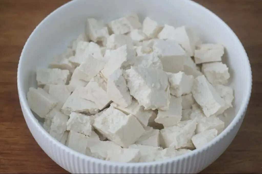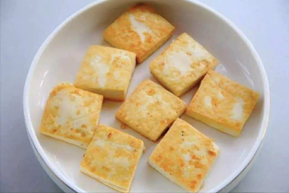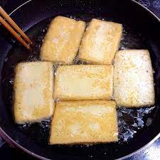 Bước 2: Đậu phụ bạn rửa sạch sau đó dùng khăn bếp thấm khô nước. Sau đó cắt đậu thành miếng vừa ăn rồi cho một chút dầu vào chảo rồi chiên đến khi vàng nâu rồi lấy ra. Tiếp theo bạn chuẩn bị một chiếc đĩa sâu lòng rồi trải đều đậu phụ xuống dưới đĩa.