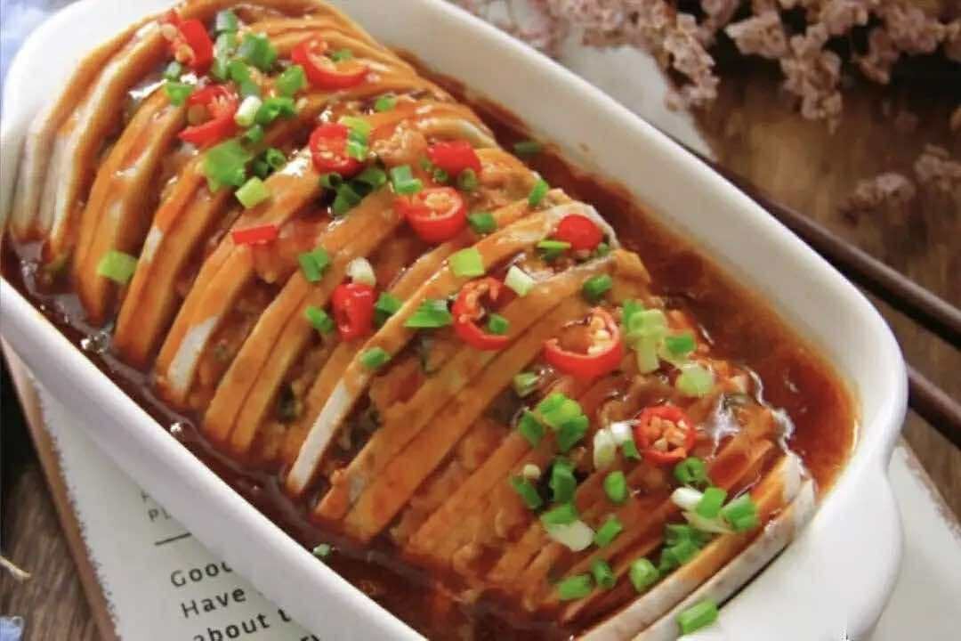 Bước 2: Cho nước vào nồi hấp rồi đặt đĩa nguyên liệu vào xửng và bắt đầu hấp. Khi nước sôi và bốc hơi, bạn tiếp tục hấp món ăn trên lửa lớn trong khoảng 10 phút. Sau đó mở nắp nồi, rắc ớt và hành lá thái nhỏ lên trên, đun thêm 1 phút rồi tắt bếp, lấy món ăn ra. Sau cùng bạn rưới lượng nước tương vừa phải lên, thêm một chút dầu mè là có thể thưởng thức.