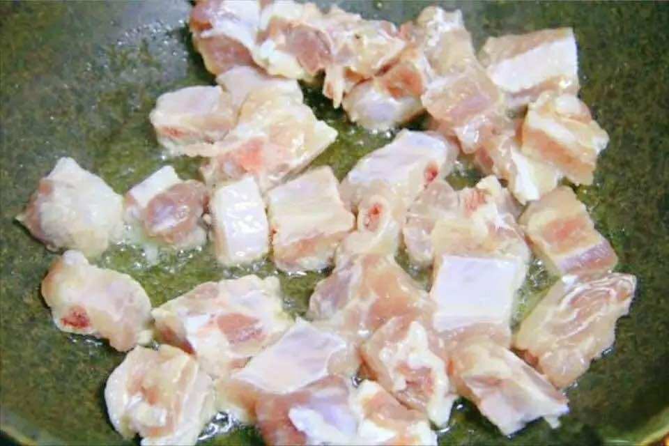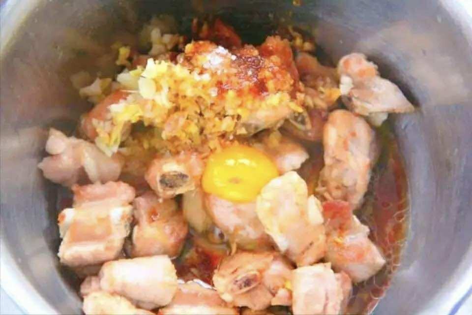 Bước 1: Đầu tiên, rửa sạch sườn và để ráo. Đun nóng dầu trong chảo và chiên sườn. Chiên cho đến khi cả hai mặt đều có màu vàng nâu, như được phủ một lớp áo giáp vàng. Cho sườn đã chiên vào âu trộn và bắt đầu nêm gia vị. Thêm tỏi băm và gừng, sau đó đánh tan trứng, dầu hào, nước tương nhạt và đường, trộn đều cho từng miếng sườn thấm đều gia vị.