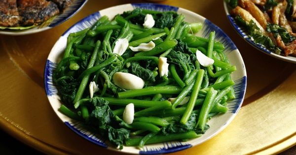 Rau muống xào tỏi không dầu: Ch ần sơ rau muống, cho tỏi đập dập vào chảo khô, xào đến khi thơm rồi cho rau vào đảo đều. Nêm ít muối, chút nước tương, tiêu. Xào lửa lớn, đảo nhanh tay, bày ra đĩa khi rau còn giòn.