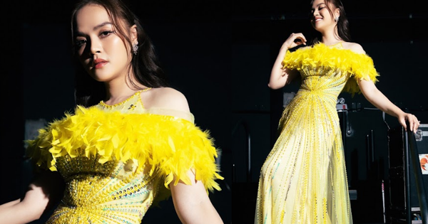 Ở vai trò first face, ‘gái hai con’ diện bộ đầm vàng rực rỡ với phần cổ được lấy cảm hứng từ áo yếm cùng chi tiết trễ vai đính lông vũ nổi bật. Phom váy dạ hội dáng dài tôn lên vóc dáng thon gọn cùng nhan sắc mặn mà của Thu Quỳnh, đồng thời chi tiết đính kết đá lấp lánh khiến mỗi bước chân của cô thêm phần uyển chuyển, duyên dáng.