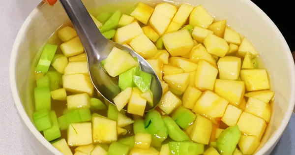 Bước 3: Cho một lượng nước vừa đủ vào nồi, đun sôi ở lửa lớn, sau đó cho táo vào và đun nhỏ lửa ở lửa vừa trong 8 phút. Tiếp theo, cho dưa chuột vào và tiếp tục đun nhỏ lửa trong 5 phút. Dưa chuột chín rất nhanh nên nếu nấu quá lâu, sẽ mất độ ẩm, trở nên nhũn và không ngon. Sau đó tắt bếp ủ trong nồi thêm 3 phút. Sau khi mở nắp, lấy bỏ vỏ táo, để nguội bớt rồi mới dùng. Không ăn khi còn quá nóng để tránh gây kích ứng dạ dày.