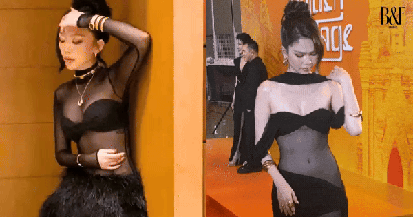 Trước khi nói đến Ngọc Trinh, phải khen rằng Tóc Tiên đã rất thành công khi “cân đẹp” thiết kế của Lê Thanh Hòa. Bộ trang phục của nữ ca sĩ tách biệt thành 2 phần với thân trên là áo lưới xuyên thấu phối cùng bra đen, trong khi thân dưới hoàn toàn kín kẽ với quần ống rộng phối cùng tà dài có chất liệu lông. Từ sự tương phản đối lập này, bộ cánh của Tóc Tiên vừa có sự cá tính lại quyến rũ nhờ sắc vóc chuẩn chỉnh của cô.