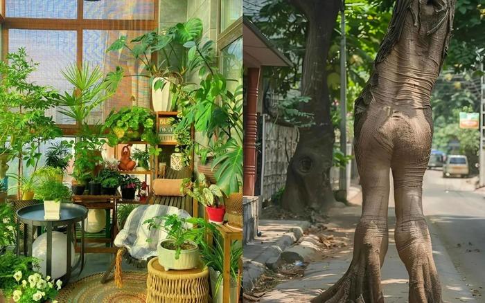 Cây trồng hai bên nhà nhưng bên trái cây thấp hơn bên phải