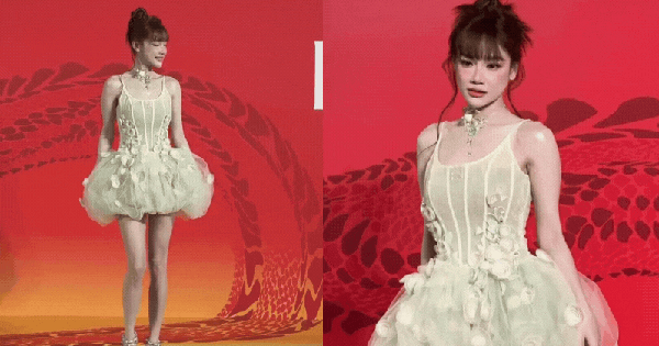 Diện thiết kế trang phục mang hơi hướng balletcore, Nhã Phương trở thành tâm điểm của sự kiện. Kiểu trang phục này đã tôn lên được nhiều ưu điểm vóc dáng của Nhã Phương, đó là đôi chân thon dài, vòng eo siêu thon gọn. Nhan sắc của Nhã Phương càng thêm “baby” nhờ kiểu tóc búi cao, thả mái thưa. Chiếc vòng choker tăng vẻ long lanh, yêu kiều cho outfit.