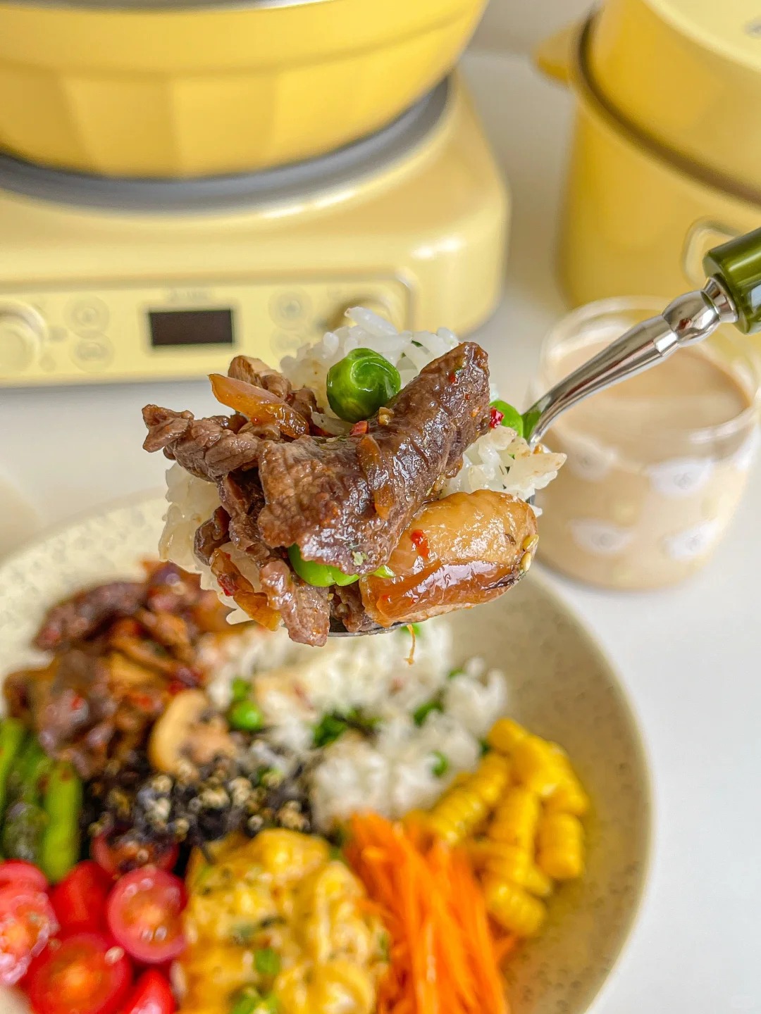 Tất cả các nguyên liệu sau khi hoàn thành được tôi bày ra đĩa như một “bữa ăn quản lý” chuẩn chỉnh: Một góc là cơm đậu xanh nóng hổi, bên cạnh là bò xào nấm thơm cay nhẹ, trứng mềm phủ hành, vài miếng cà chua bi đỏ mọng, vài thanh măng tây xanh, hạt ngô vàng xen lẫn cà rốt cam. Tôi rắc thêm ít vụn rong biển để món ăn vừa có vị biển nhẹ, vừa thêm phần bắt mắt.