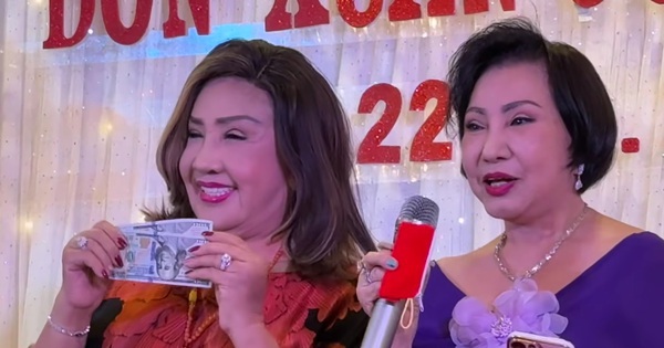 Nghệ sĩ Diệp Tiên nghe vậy liền lên sân khấu lì xì NSND Lệ Thủy 200 đô la. Nữ nghệ sĩ tỏ ra vô cùng thích thú.