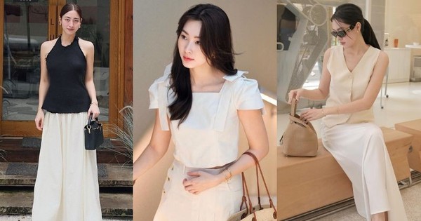 Chị em vẫn có được vẻ ngoài rất nổi bật khi diện đồ trắng. Hoa hậu Phương Khánh gợi ý outfit gồm áo thêu hoa nhí kết hợp cùng chân váy trắng dáng dài. Thao tác sơ vin tạo sự gọn gàng cho tổng thể, đồng thời tôn dáng hiệu quả ngay cả khi chị em đi giày bệt. Phương Khánh nâng tầm vẻ yêu kiều, tiểu thư cho bộ cánh bằng một đôi giày mary jane.
