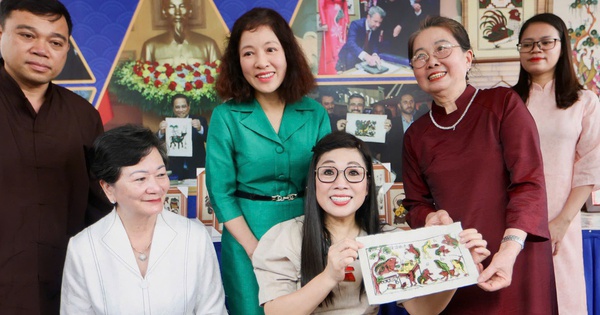 Phu nhân Lê Thị Bích Trân bên bức tranh Đông Hồ bà tự in – Ảnh: NGUYỄN KHÁNH
