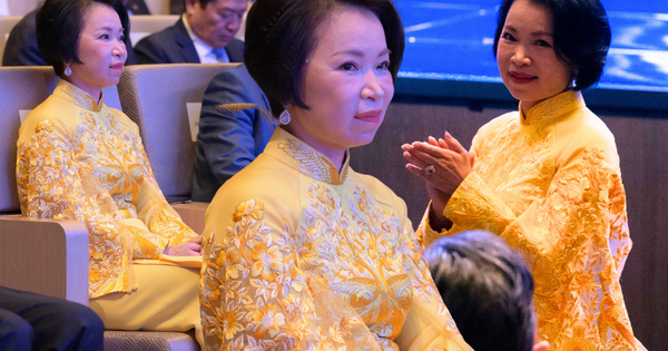 Tone màu vàng không chỉ nổi bật và toát lên sự quyền lực của phu nhân tỷ phú mà còn tạo nên sự đồng điệu tinh tế với trang phục của các đấng mày râu trong gia đình. Chủ tịch Phạm Nhật Vượng và hai con trai đều sử dụng caravat màu vàng – gam màu hiếm hoi ông Vượng lựa chọn trong các sự kiện lớn.