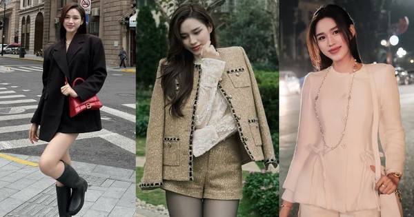 Đỗ Thị Hà kết hợp áo khoác điệu cổ tròn với quần short để tạo nên outfit không chỉ yêu kiều mà còn trẻ trung. Tổng thể bộ đồ trở nên sang chảnh hơn nhờ vòng cổ ngọc trai, quần tất đen. Bộ cánh trên rất phù hợp để mặc đi du xuân.