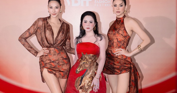 Cùng với ‘bông hồng thép làng mốt’, Võ Hoàng Yến, Hoàng Thuỳ và đạo diễn catwalk Nhã Trúc mang đến nguồn năng lượng mạnh mẽ. Võ Hoàng Yến diện thiết kế váy mini dáng halter ôm sát cơ thể, giúp khoe trọn đường cong và đôi vai thon. Họa tiết ngựa cùng tông màu nâu – đỏ gợi nét hoang dã, tạo cảm giác vừa nghệ thuật vừa phóng khoáng.