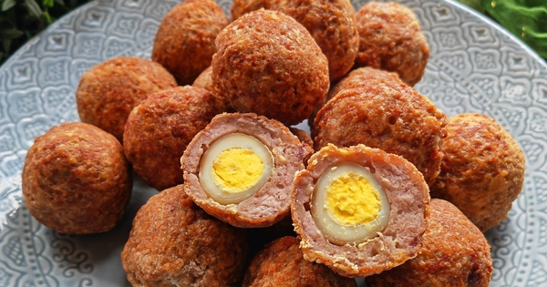Trộn một chiều cho thịt “lên chân” dẻo kết dính, thử bằng cách nhấc đũa thấy quện là được. Cách gói rất đơn giản: Ấn dẹt thịt trên tay, đặt trứng cút đã luộc và bóc vỏ vào giữa, vuốt kín không để lộ lòng trắng. Viên xong để lên khay cho ráo bề mặt rồi chiên hai lần. Lần đầu ở nhiệt vừa để định hình và chín tới, lần hai tăng nhiệt cho vàng giòn mặt ngoài.
