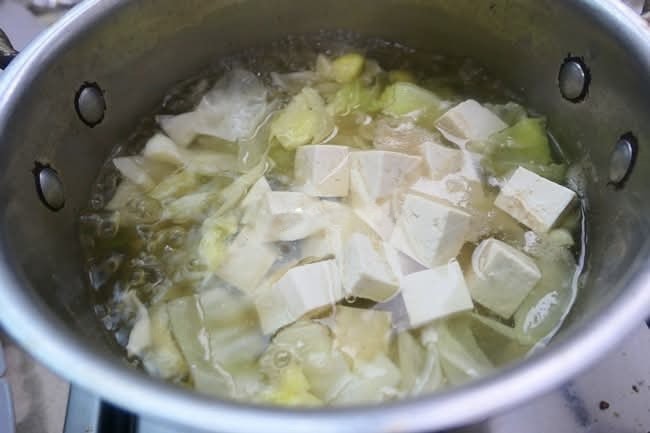 Bước 2: Đổ một ít dầu ăn vào nồi, đun nóng, cho gừng thái lát vào xào đến khi dậy mùi thơm. Sau đó, cho phần bẹ cứng rau cải thảo vào xào trên lửa lớn trong khoảng 1 phút, đến khi rau cải thảo hơi mềm. Tiếp theo, cho đậu phụ thái nhỏ và lá cải thảo vào, đổ lượng nước sôi vừa đủ ngập nguyên liệu, đun sôi trên lửa lớn. Sau đó giảm xuống lửa vừa nhỏ, đậy nắp và đun liu riu trong khoảng 10 phút.