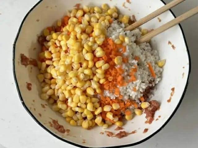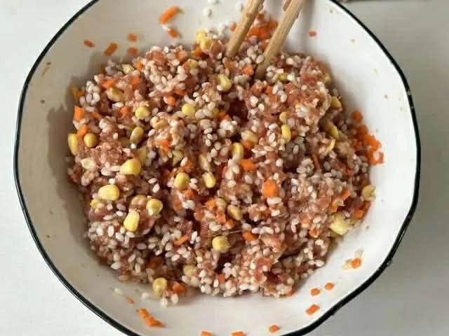 Bước 2: Cho gạo đã ngâm vào tô thịt băm. Sau đó thêm một lượng hạt ngô vừa đủ và cà rốt, một chút muối. Tiếp đó rắc một chút xíu muối (tùy khẩu vị) rồi dùng thìa trộn đều. Lưu ý trộn các nguyên liệu phải đảm bảo gạo nếp và các nguyên liệu được phân bổ đều, tạo thành hỗn hợp sệt và ẩm. Sau đó để yên trong 5 phút nhằm giúp gạo nếp thấm bớt nước sốt.