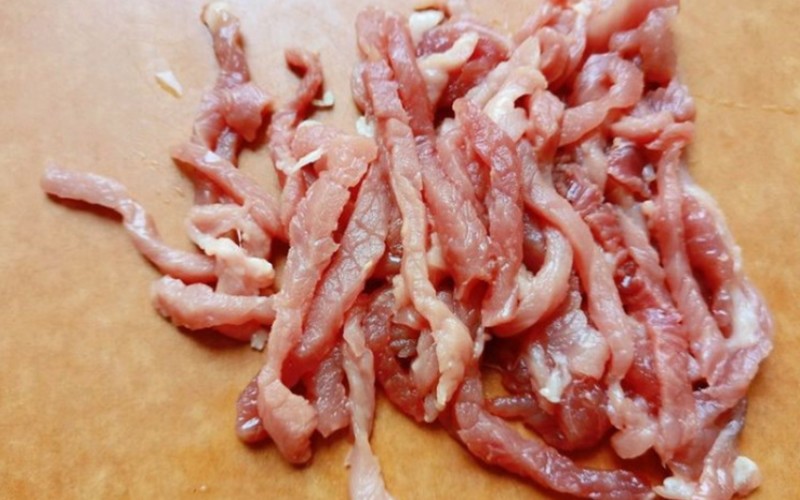 Bước 1: Thịt nạc thăn bạn rửa sạch sau đó thái thành dạng sợi dài, nhỏ. Cho thịt heo vào bát, thêm 1 thìa canh nước tương, một chút dầu hào, bột rồi trộn đều. Sau đó bạn thêm bột năng vào, tiếp tục trộn cho hòa quyện. Sau đó thêm chút dầu ăn vào, trộn đều để khóa ẩm. Ướp thịt trong khoảng 15 phút. Rau hẹ nhặt bỏ lá úa, rửa sạch, để ráo nước rồi cắt thành các khúc ngắn, để riêng.