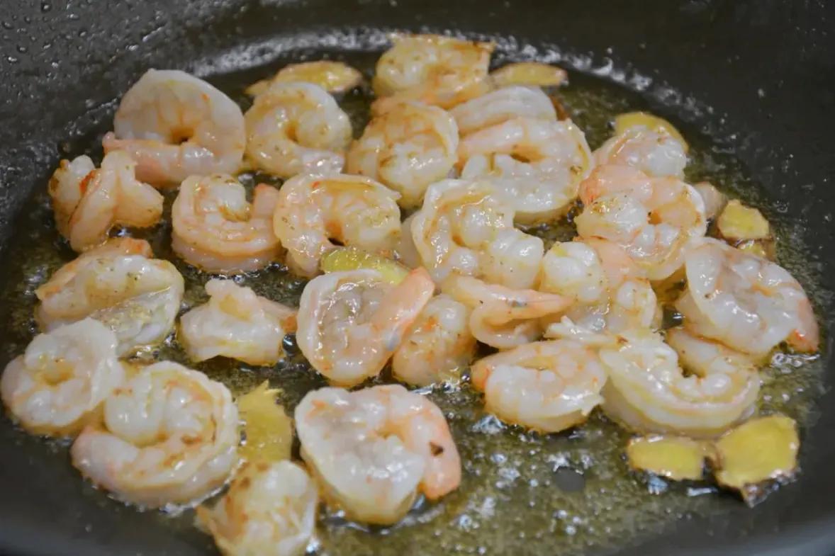 Bước 2: Tiếp đó bạn cho tôm vào chảo, xào nhanh tay đến khi chuyển màu. Sau đó bạn nêm rượu nấu ăn và 1 thìa canh nước tương hải sản, một ít gừng thái nhỏ, tiếp tục xào trong 30 giây. Sau đó bạn cho rau hẹ vào xào cùng trong 1-2 phút, cho đến khi hẹ chín.