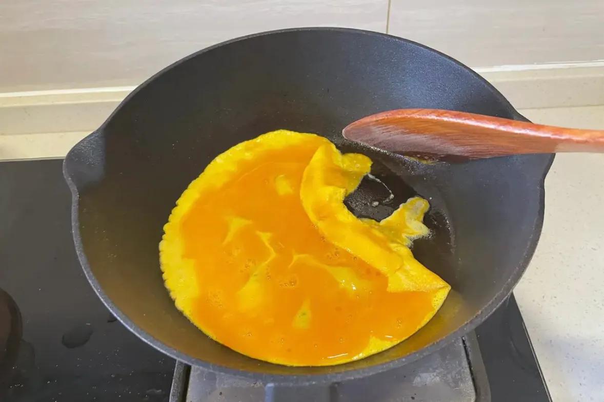 Bước 1: Rau hẹ nhặt bỏ lá vàng, úa rồi rửa sạch, cắt thành khúc ngắn. Tôm bạn có thể dùng loại đông lạnh hoặc tôm tươi đã được bóc bỏ vỏ, rút chỉ sống lưng. Đập trứng vào bát, thêm một chút muối và nước rồi đánh đều. Sau đó đặt chảo lên bếp, thêm chút dầu ăn vào, đun nóng. Khi dầu nóng khoảng 80%, cho trứng vào bác đến khi đông lại thì lấy ra đĩa, để dùng sau.