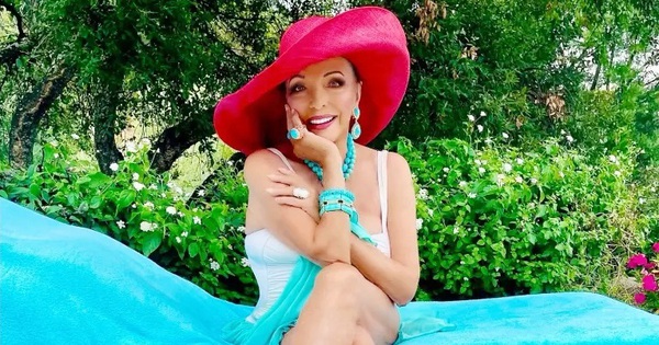 Ngôi sao phim “Dynasty”, 92 tuổi, làm nổi bật bộ đồ bơi của mình với mũ chống nắng màu đỏ, vòng tay ngọc lam, nhẫn và hoa tai thả. Biểu tượng phim truyền hình dài tập này cũng khoe móng chân màu đỏ sẫm và son môi màu hồng.