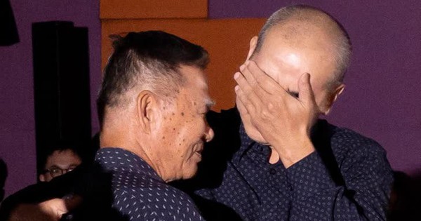 Đạo diễn Bùi Thạc Chuyên khóc khi ôm anh hùng Tô Văn Đực – người đã tham gia tư vấn và đồng hành với phim suốt quá trình quảng bá – Ảnh: ĐPCC